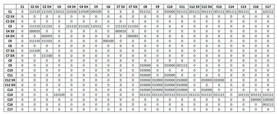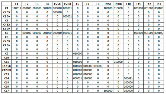 In the CFM (components fasteners matrix), the vector of the j-th row represents the limitations due to the presence of the fasteners that the component j has along the directions in which it can be removed (if we are in a two-dimensional space, the possible directions are −x, + x, −y, and + y, while in a three-dimensional space, we also have −z and + z). If a fastener prevents the movement along the removal direction of the j component, 1 will be inserted in the corresponding cell, otherwise 0. Therefore, if 1 is present in a certain cell, it means that the component is blocked by the fastener, whereas if 0 is present, the component is not blocked by the fastener along the direction in which it is removed.