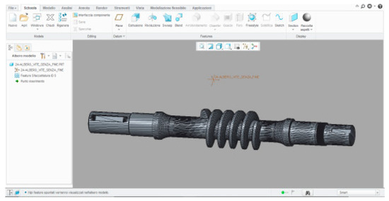 In order to realize the profile of the endless screw, the “extrusion with sweep” function was used, supplying the profile of an involute tooth as a profile and a helix path, while to make the teeth of the toothed wheel, the “cut with sweep” function was adopted, using as the profile that of an evolving tooth and as the path a segment of the required length and inclination (Figure 7 and Figure 8).