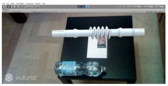 In this way, using a webcam to frame a print of the image used as ImageTarget with marker function, an augmented reality view of the loaded objects can be appreciated in the computer monitor once the Game mode has been started with the Play button (Figure 27, Figure 28, Figure 29 and Figure 30).
