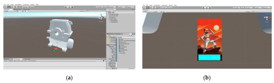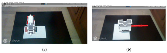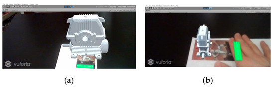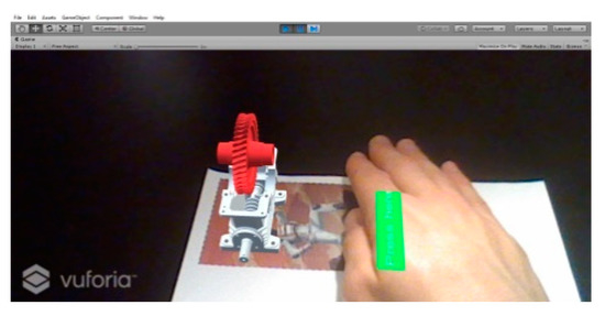 To have a greater interaction with the reducer represented in AR, the authors created VirtualButton, which allows the animation to start only after the virtual button is “pressed”. In this way, when the webcam frames the marker, it will be possible to see the stopped gear and the virtual button positioned above the marker: As soon as the user interposes between VirtualButton and ImageTarget (for example, using the hand), the animation is started. This grants greater flexibility to the user, allowing them to view the animation when he prefers (Figure 32a,b and Figure 33a,b).