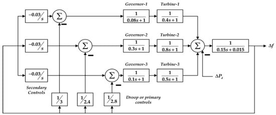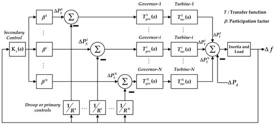 Figure 1 shows a general block diagram of the LFC model of a multi-machine power system. The system is equipped with primary or droop control (with droop control value represented by in Figure 1) and secondary control. Typically, the secondary control is a part of automatic generation control and provides an integral control action to diminish the steady-state frequency deviation. For the objective of frequency response analysis and control under a load disturbance (), Equation (1) models the frequency deviation as follows [,].