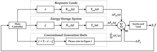Considering an escalated and simultaneous integration of responsive loads and ESS in smart grids, further research is needed to discuss their combined role. The authors of this work presented a modified LFC model considering responsive loads and ESS and discussed their individual and combined role in improving the frequency response []. In Reference [], a droop controlled distributed generation framework integrated with DR is developed for frequency regulation with the objectives of emission reduction and cost minimization. The work presented in References [,] considers renewable energy resources and demand response in the context of a virtual power plant.