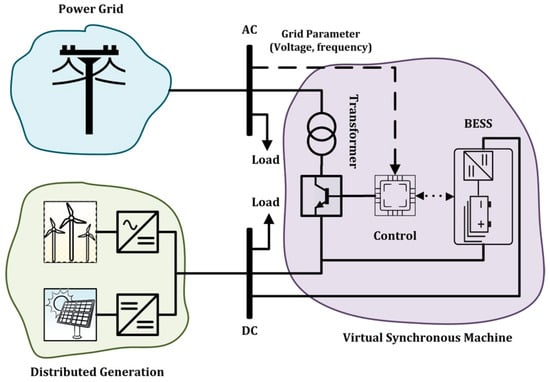 In the conventional power systems, massive machines of large power systems have inherent inertia which improves the system’s stability. On the other hand, renewable energy systems in smart grids have no, or very small, rotating masses which cannot provide sufficient inertia as compared to the traditional power plants. So, the increased penetration of renewable energy resources poses a challenge to the grid stability. A successful solution to the low inertia problem is proposed in the form of a control system called virtual synchronous machine that provides virtual inertia (VI) [,]. Such a control system utilizes BESS as a source of power and other main constituents are a power converter and a controller, as shown in Figure 3. The idea behind a virtual synchronous machine is to imitate the dynamic model of a real synchronous machine to improve the grid stability. From the operational point of view, the nominal state of charge of BESS is kept at 60~70% of rated capacity during normal conditions. In this way, BESS can absorb or inject power during contingency or emergency events. Thus, there are two main operating modes of a virtual synchronous machine as follows:
