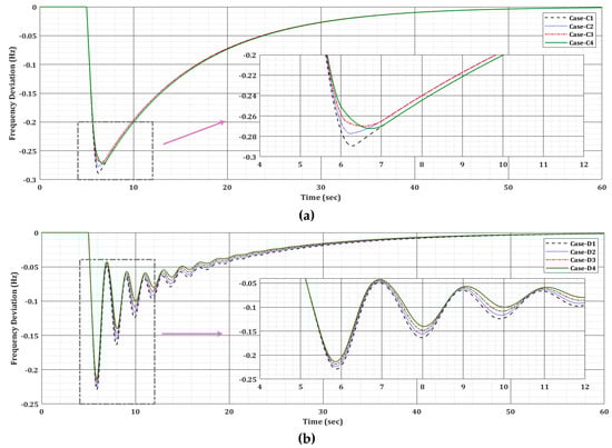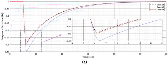 Figure 5a shows the frequency response for individual machines when a load disturbance () is applied to the system at . The response of Machine-2 (Case-A2) is slower due to higher values of governor and turbines time constants as compared to other machines. Response of Machine-1 is the fastest as its governor and turbine have lower time constants.