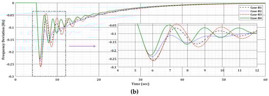 The frequency response for two or all machines when a load disturbance () is applied to the system is shown in Figure 5b. As expected, the lowest value for maximum frequency deviation is observed when all the three machines are operational as indicated by Case-B4.
