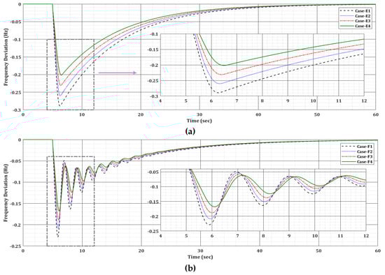 Figure 7. Frequency response under load disturbance when the test system is equipped with ESS (a) frequency deviation for test cases (E1-E4); (b) frequency deviation for test cases (F1-F4). - The impact of ESS in the presence of all three machines is shown in Figure 7b and depends on its share (). Generally, higher the value of , better the frequency response. Moreover, the response of ESS is quicker in comparison to the responsive loads and conventional schemes as well.