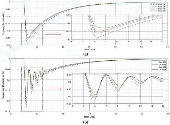 Frequency response under load disturbance when the test system has responsive loads and ESS (a) frequency deviation for test cases (G1-G4); (b) frequency deviation for test cases (H1-H4).