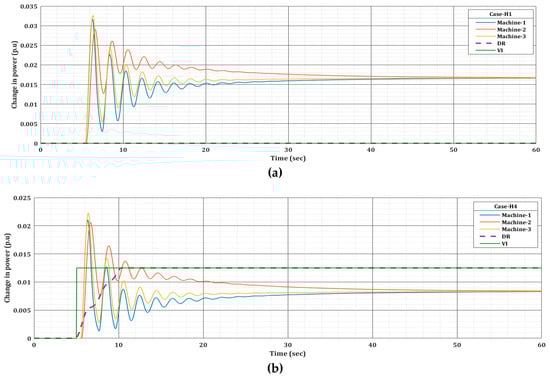 Change in power (p.u) for machines, demand response (DR) and virtual inertia (VI) resources (a) Case-H1 with 3 machines only; (b) Case-H4 with DR and VI resources in addition to 3 machines.