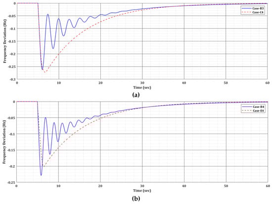 Comparison of various configurations (a) comparison of a 2-machine system case (B3) with a single machine system augmented with responsive loads (C4); (b) comparison of a 3-machine system case (B4) with a single machine system augmented with ESS (E4).