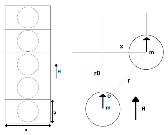 where JP is the dipole moment magnitude per unit particle volume. The parameter h = r0/d gives an indication of the distance between the particles. Based on the schematic of Figure 1, b = d·h, and the gap between the particles is equal to d·(h − 1). The particles are equally spaced if a = b and the iron particles’ volume fraction ϕ is