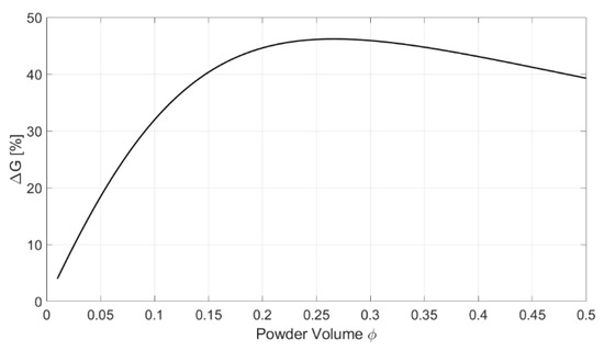 Figure 2 shows the MR effect as a function of the H field for ϕ = 0.27 and for some values of the matrix shear modulus, G0. The curves were obtained for iron saturation magnetization Ms = 2.1 T, μp = 1000, and μ1 = 1 (elastomeric matrix). It can be observed that the MR effect is greater for lower values of G0. The maximum values of ΔG, as a function of the powder volume fraction ϕ, are shown in Figure 3.