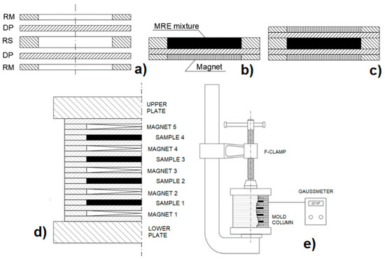 The samples were formed in a nylon mold (Figure 4) (RS), in which the MRE liquid mixture was cured; two plastic diaphragms (DP) were adopted to separate the mixture from two neodymium permanent magnets, contained in plastic rings (RM) and characterized by a maximum energy product of 263–287 kJ/m3. The magnetic field generated by the permanent magnets had the effect of orienting and aligning the particles according to the force lines of the magnetic field.
