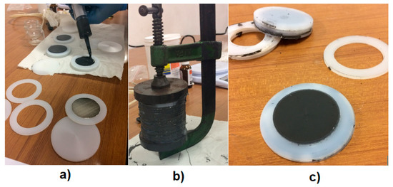 Figure 5 shows several depictions of the sample preparation phases. The sample diameter and height were equal to 50 and 6 mm, respectively. The main sample properties are reported in Table 1; it was noted that the shore-A hardness did not vary as the magnetic field increased.