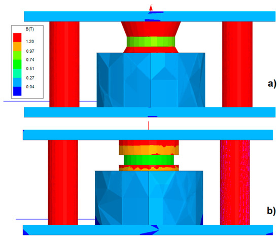 In the second configuration, to optimize the magnetic flux, the two cylindrical steel elements were replaced with two conical frustum elements with the following dimensions: bottom diameter: 60 mm; top diameter: 24 mm; height: 10 mm (Figure 6b). In this case, to reach the saturation value of the magnetic field, only 6000 ampere-turns were required.