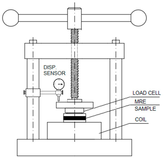 The axial characterization was performed by assigning a continuously increasing and decreasing compression deformation to the MRE sample at the rate of about 0.01 mm/s. The test was repeated for different current intensities circulating in the coil windings. The axial force exerted by the screw press was detected by means of a load cell (Figure 7), while the corresponding deformation was detected by means of a centesimal comparator.