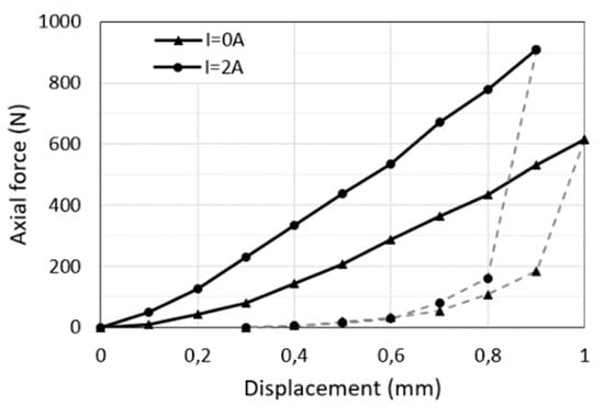 The first test was conducted with the material not activated (i.e., the coil not powered). The force–displacement trend (Figure 8) was almost linear (slightly hardening). At the beginning of the unloading phase (dashed line), the load exhibited a sharp reduction attributable to the material hysteresis. Figure 8 shows the test performed by feeding the coil at 2 A. There was an evident axial stiffening (about 65%), and in this case, at the beginning of the unloading phase, the diagram shows that there was a consistent force reduction.