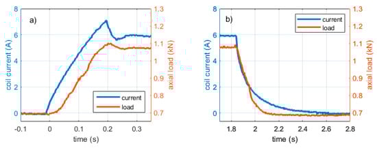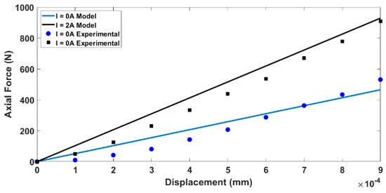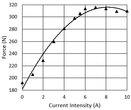 Another kind of static test was performed on the sample; without feeding the coil, the sample was compressed between two plates. Keeping constant the distance between the plates, the axial force was then measured as the values of the coil current intensity increased. The results of this test, as reported in Figure 10, show that the axial force increased, with an almost linear trend, until the current intensity reached 6 A, with an axial load increment equal to about 63%; under greater current intensity, the axial load did not increase further (saturation).