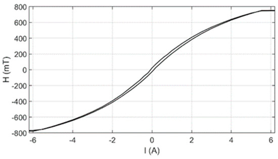 The magnetic field crossing the sample was measured by placing the gaussmeter probe between the sample and the plate. Figure 12 shows the relationship between the magnetic field H crossing the sample and the coil current intensity I. The curve was detected up until a current intensity of about 6 A, after which no stiffness variation occurred.