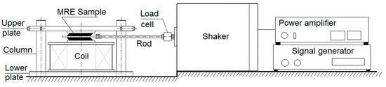 To characterize the MRE shear properties, the samples were tested under a constant compression load and variable shear excitation. The tests were conducted by placing two equal cylindrical samples (diameter: 50 mm; height: 6 mm) on opposite sides of a plastic platelet (Figure 13). The platelet, connected to an electro-dynamic shaker by means of a rod, provided a shear harmonic load to the samples. The samples were axially deformed by adjusting the distance between the two contact surfaces, which were composed of the magnetic core of a coil and a plate whose position could be adjusted to assign a desired axial deformation. The corresponding axial load ensured that the elements did not slip under the transverse load transmitted by the shaker.