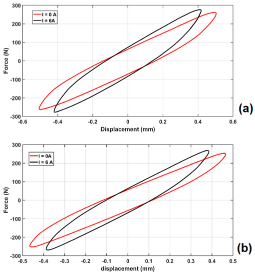 To highlight the influence of the forcing frequency and of the magnetic field intensity on the stiffness and damping properties of the MRE samples, several force–displacement diagrams were obtained for different operating conditions. Figure 14 shows the test results performed at the forcing frequencies of 5 and 10 Hz with two different values of coil current intensity (0 and 6 A).