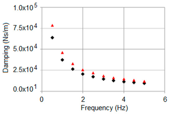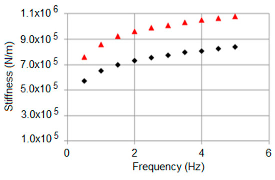 The results of all the tests are summarized in the following diagrams. Figure 15 shows that the stiffness increased with the excitation frequency and with the intensity of the magnetic field. Furthermore, damping decreased with the excitation frequency (Figure 16) and increased as the coil current intensity increased.