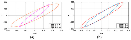 Finally, several tests were performed to investigate the preload influence on the sample’s lateral stiffness. Force–displacements cycles (Figure 17) were detected under a forcing frequency of 2 Hz with two preload values (200 and 700 N) and two different values of coil current intensity (0 and 6 A). The graph shows that there was a stiffness increase in both cases; the percentage increase was greater in the case of the lower preload (+82%), while it was lower in the case of the higher preload (40%).