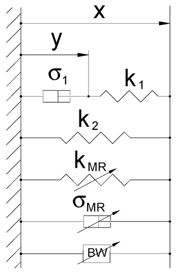 The proposed formulation uses the “standard linear model” to evaluate the linear visco-elastic behavior of the rubber. The hysteretic mechanism is well explained in [21]; the correspondent component can be modeled in several modes; some recent models having high computational efficiency are now available as, for example, that based on the shape function and memory mechanism [22] or the resistor-capacitor operator-based one [23]. In the following, the Bouc–Wen model [24] is adopted. The magneto-rheological effect is evaluated through the variable stiffness Kmr and the variable damping σmr and the restoring force is expressed by the following expressions: