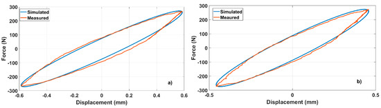 Figure 19 shows that there was a good agreement between the measured and simulated force–displacement cycles for the two different operating conditions.