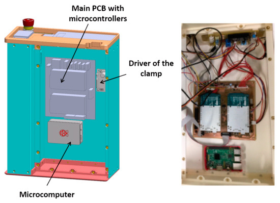 The mechanical layout is split into three layers, each one hosting a set of components. The first layer, which can be identified as the ‘backbone’ panel, hosts the main electronic components, including two microcontroller boards and a single-board microcomputer. The functionality of these devices, which implement the system control architecture, will be described in detail in Section 6. The CAD sketch and a picture of the first layer are shown in Figure 2.