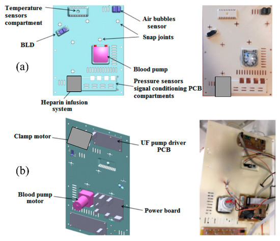 The ‘intermediate’ panel hosts other non-disposable components. The main ones are the peristaltic blood pump, the heparin infusion system, the custom-built electromechanical safety clamp, the air sensor, the temperature sensor and the BLD. These components are visible on the front of the panel, as shown in Figure 3. Looking at the backside of the panel, the ultrafiltrate pump driving circuit and the board for the signal conditioning circuit are visible.