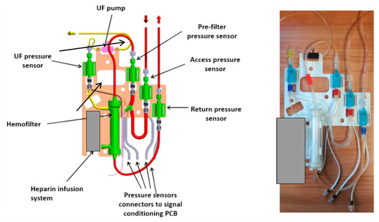 The third or external layer of the RAP hosts all the disposable components (the priming volume, included the filter, is almost 60 mL): the polyvinylchloride blood circuit, the hemofilter (priming volume 33 mL), the disposable elements of the heparin infusion system, the pressure sensors and the piezoelectric pump that displaces the ultrafiltration liquid.