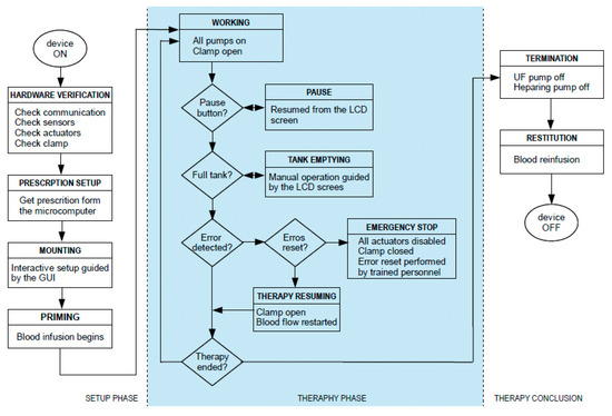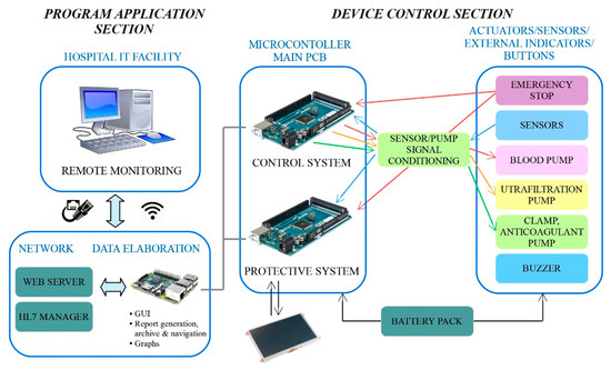 Each treatment is customized on the basis of the medical prescription through the GUI that runs on the Raspberry PI microcomputer, which translates them into a cluster of numeric set-points, which are in turn transferred to the device control section. Data sent from the device control section to the program application section include the key information on the status of the system (pressure values, amount of the ultrafiltrate removed, etc.). Such communication is performed through a USB connection between the microcomputer and the two microcontroller boards.