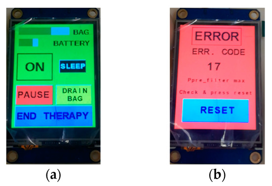 The therapy phase can be paused at any time by stopping the blood pump. This can be done easily by touching a dedicated key on the touch sensitive LCD panel, or alternatively, through the GUI running on the microcontroller. The same methods also allow the therapy to resume. If the duration of the “pause” phase lasts more than 2 min, the machine raises an alarm for prolonged blood stagnation. The same check is made when the emergency stop button is pressed. Figure 8a shows examples of messages appearing on the LCD panel during a therapy; information fed back to patients includes the battery charge status and the amount of liquid accumulated in the ultrafiltration tank. The ‘drain bag’ button should be pushed just before manually emptying the tank in order to set up the device properly. The detection of a safety hazard triggers the immediate stop of the procedure, which is then signaled on the LCD screen, as can be seen in Figure 8b. Each possible safety hazard is identified by a numerical code, and each error event is logged.