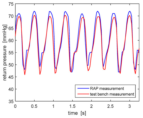 All tests have been carried out by circulating 0.9% saline solution, with a density almost identical to water. The frequency of acquisition of pressure values measured by both devices has been equaled (20 Hz) in order to compare the two signals properly. Figure 9 shows the typical peristalsis-induced trend of the return pressure: the data collected by the test bench pressure measuring system are consistent with the ones measured by the RAP. This consistency has been checked, with similar results, for all three RAP pressure sensors (access, pre-filter and ultrafiltrate pressures). Based on these results, the choice of the pressure sensors and the signal conditioning procedure adopted in the RAP have been considered suitable.