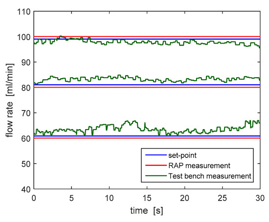 Blood flow rate estimated in the RAP and measured by the test bench at different set values (60, 80 and 100 mL/min).