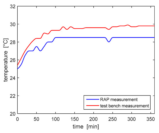 Subsequently, the temperature sensor of the RAP, which measures the temperature of the air inside the device housing, was validated. Temperature values have been recorded every 10 min for a total treatment duration of 5 h and 12 min. Figure 11 shows the comparison of temperature values read by the two measurement devices, with a room temperature equal to 25.5 °C. The maximum percentage error recorded was 5%; according to the results of the risk analysis this measurement error does not provide any actual safety hazard. The temperature measurements show that the initial temperature, 25 °C, increased to the stable measure of 30 °C within the first hour of operation, thus no overheating was detected.