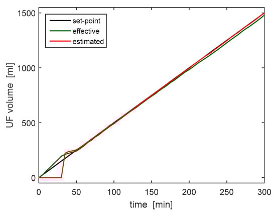 Figure 12 shows the measurement collected during the 5-h trial; the plot compares the UF volume set point (equal to 5 mL/min), to the estimated and measured volumes. With the exception of a short initial interval, when it was not possible to estimate the extracted volume due to the design of the UF tank, the liquid removal rate was estimated correctly and follows the desired one with a minimum error. This test therefore validated both the reading and the regulation of the ultrafiltrate removal rate.