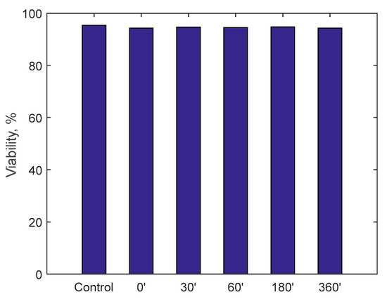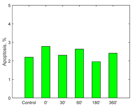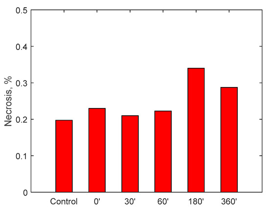 A specific cell line, monocyte line U937, which is considered to be the gold standard for cytotoxicity analyses, was incubated for 24 h in the samples taken. At the end of the 24 h, via a cytofluorometer, values of viability, necrosis (cell death due to artificial causes) and apoptosis (cell death due to natural causes) of the incubated monocytes were evaluated. These values were compared with a control sample. The analysis of the samples was translated into percentage of viability, necrosis and apoptosis, as displayed in Figure 13, Figure 14 and Figure 15. Data show, for all three parameters, similar values with respect to the control samples within 6-h running time of the procedure, highlighting minimal cytotoxicity. These results confirm the absence of adverse reactions, potentially due to high mechanical stress, increased temperature, release of contaminants or reaction products as a consequence of the contact with external materials and components of the RAP prototype.