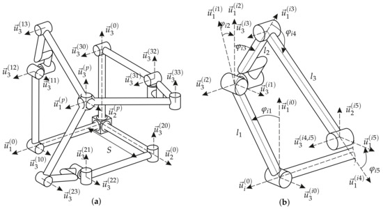 In Figure 1a, first refecence frames of the each serial chain are located on orthogonal axes along kth axis for . stands for the jth frame in ith serial chain as shown in Figure 1b. due the kinematic constraints. p is mobile platform frame. Besides, are always aligned with vectors, respectively. The forward kinematics is given as: