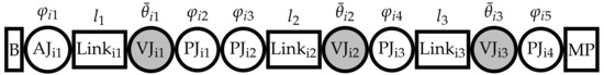 can be divided into sub-matrices as and . They denote Jacobian matrices of virtual and passive joints. Sub-matrices are presented as follows: