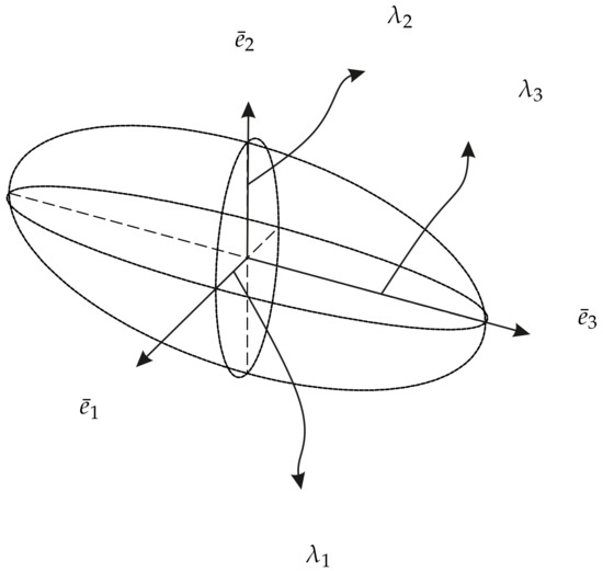 The graphical illustration of eigenvectors and eigenvalues generates an n-dimensional surface. This surface becomes a line for , an ellipse for , an ellipsoid for , and a hyper-ellipsoid for . The radii and axes of ellipsoids are defined by eigenvectors and eigenvalues as shown in Figure 3 for [26].