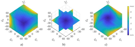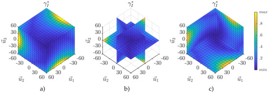 Normalized volumetric isotropy iso-curves: (a) 60 mm along , (b) 0 mm along , (c) mm along .