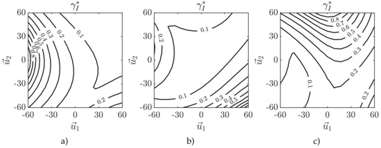 Figure 7 and Figure 8 show the iso-curves in planes for , and , respectively. These planes are positioned along and they are located at 60 mm,0 mm, mm. Figure 8 shows that the covered area by the iso-curves for is higher than the area of in Figure 7. Hence, captures more isotropic poses. Accordingly, iso-curves for cover more area than the area covered by the same value of . This indicates that the manipulator is less isotropic with respect to . In addition, notice that the distance between the iso-curves are less for in Figure 8 compared to in Figure 7. Therefore, is more sensitive to isotropy changes.