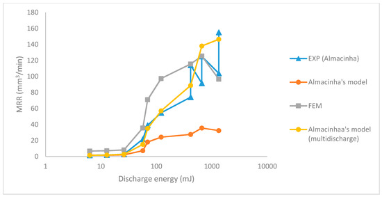 | Discharge Energy (mJ) | Discharge Current (A) | Time-On (μs) | Time-Off (μs) | Exp (Almacinha) | Almacinha’s Model | FEM |