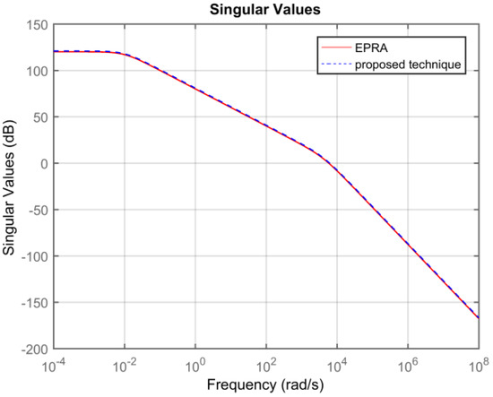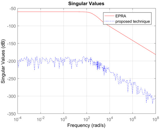Symmetric System: Consider the 84th order SISO dynamic system represented by partial differential Equations taken from [27]. A 13th order reduced plant model is obtained using EPRA, and the proposed algorithm by setting . Table 1 shows a comparison between both techniques in terms of the weighted error . The simulation time in seconds yielded by both techniques are compared to check their computational efficiency. Figure 3 shows the weighted error . The controllers are designed for the reduced plants using the loop shaping procedure in [24,25,26]. Figure 4 shows the loop shape achieved using both techniques. The order of controllers obtained for 13 order reduced plants using EPRA, and the proposed algorithm is 14. The controller is further reduced to obtain a more compact controller of order 6 using FWBT and cross-gramian based FWMOR (steps 18–25 of Algorithm 1). Table 2 shows an error comparison in terms of weighted error for a 6th order controller. Figure 5 shows the weighted error . Figure 6 shows the loop shape achieved with this 6th order controller.