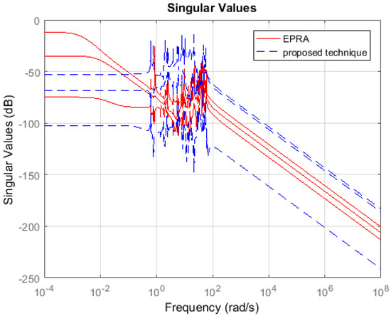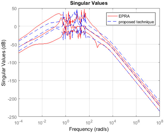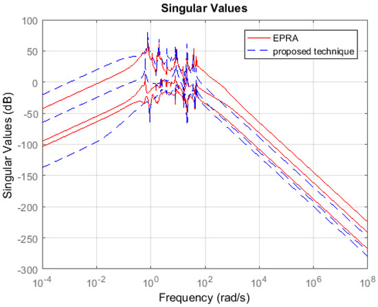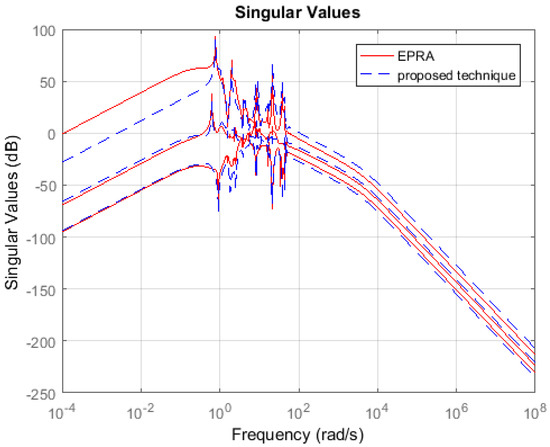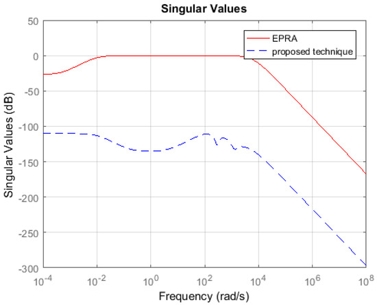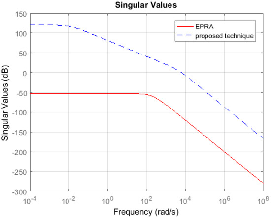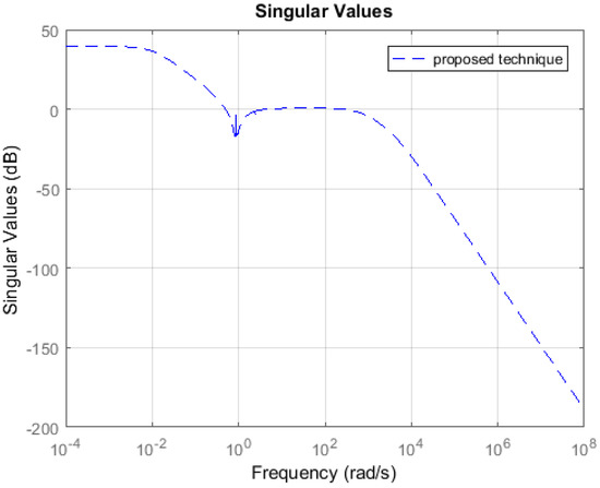 Non-symmetric System: Consider the international space station model in [27] which is a 270th order system with 3-inputs and 3-outputs. The model is a square but non-symmetric MIMO system. A 100th order reduced plant model is obtained using EPRA and Algorithm 1. Table 1 shows a comparison between both techniques in terms of the weighted error . The simulation time in seconds yielded by both techniques are compared to check their computational efficiency. Figure 7 shows the weighted error . The controllers are designed for the reduced plants using the loop shaping procedure in [24,25,26]. Figure 8 shows the loop shape achieved using both techniques. The orders of controllers obtained for 100th order reduced plants using EPRA and the proposed technique are 246 and 248, respectively. The controller is further reduced to obtain a more compact controller of order 20 using FWBT and cross-gramian based FWMOR (steps 18–25 of Algorithm 1). Table 2 shows an error comparison in terms of weighted error for the 20th order controller. Figure 9 shows the weighted error . Figure 10 shows the loop shape achieved with this 20th order controller.