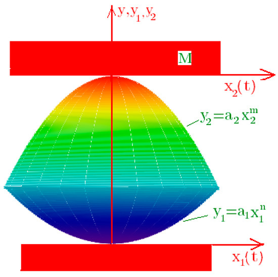 We assume that the foundation of the considered body has a small plane length, allowing us not to take into account the asynchrony of transmission of external influence from the various points of the foundation and vibro-insulated body. Equation (1) refers to the coordinate system associated with the rolling bearings (see Figure 2). The curvature radius of the vertices of these surfaces at tends to infinity, i.e., there is straightening of the bearing surfaces. Let us denote the horizontal offset of the bases as . As we denote a displacement of the upper body, supporting on the rolling bearing.