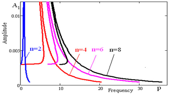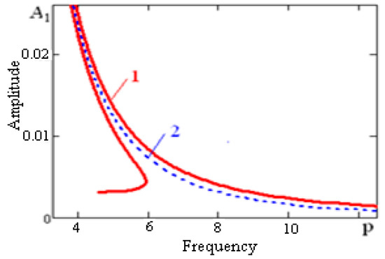Dependence of the system frequency on the amplitude built by the trigonometric collocation method is shown in Figure 3. The dotted line, carried out in the graph, is built on the basis of the second approximation Equation (26). The solid line is the curve of the first approximation Equation (25).
