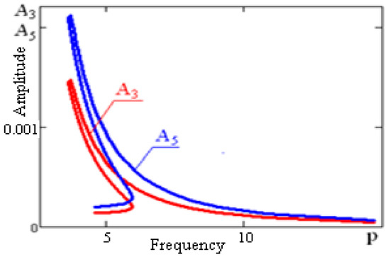 As an example for the parameters, given in Section 4. we have built a graph, determining the dependence of the system amplitude on the frequency of disturbances corresponding to first, third, and fifth harmonics at value of kinematic disturbances amplitude (See Figure 5 and Figure 6).