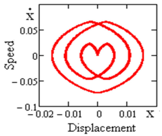 In Figure 9 and Figure 10, two-dimensional projections of a phase-portrait and dispensation of spectral concentration (Fourier-spectrum) of periodic oscillations of the vibro-protected bodies on the rolling bearings with straightened surfaces at 5.65 value of kinematic disturbance frequency are shown.